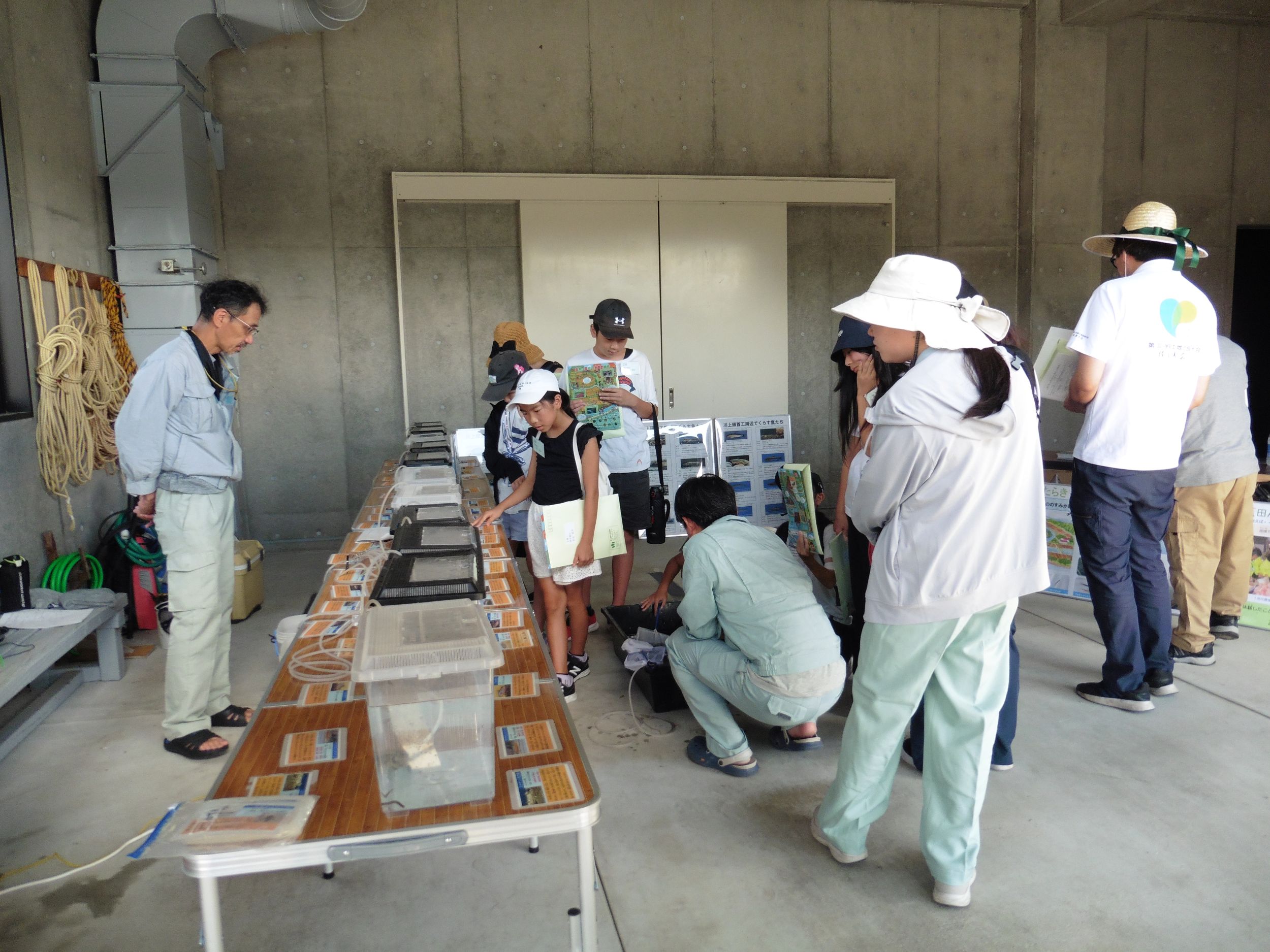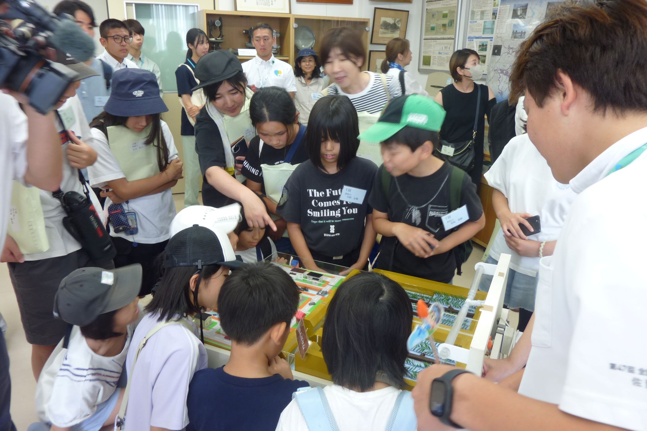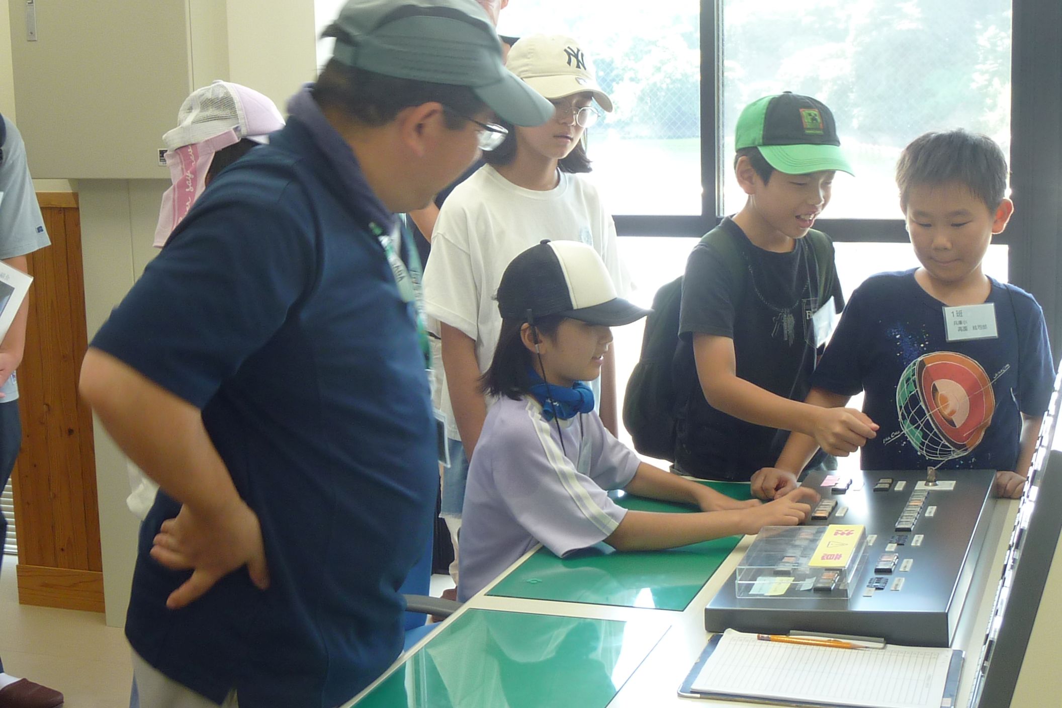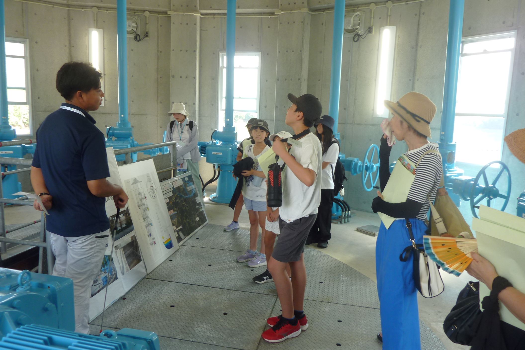 ダムの概要や各施設の役割について学び、操作室では取水ゲートの模擬操作を体験しました。また車庫では九州農政局と一般社団法人九州環境管理協会のご協力のもと、パネル展示や生き物観察を行い農業の大切さについて考えてもらいました。