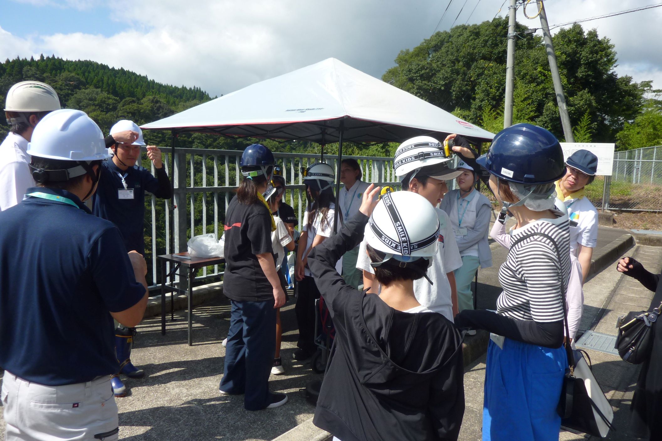 ヘルメットをかぶって堰堤から約50メートル下まで階段を降りて行き、ダムの最深部で「監査廊」の役割を学びました。また、実際に職員が点検している「湧水量の測定」を体験してもらいました。