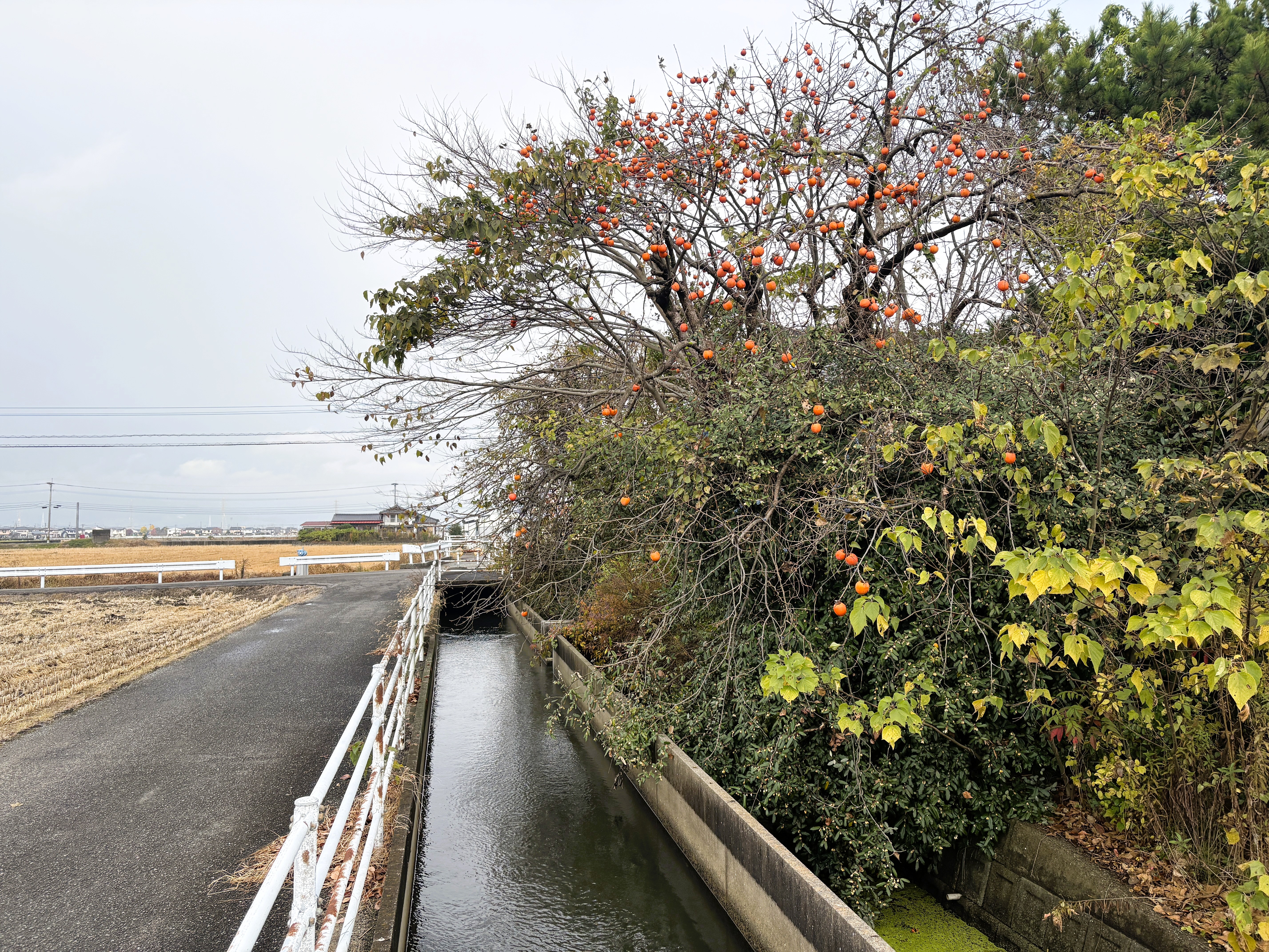 晩秋の柿の木と西水東水幹線水路の様子です。(R7.11.25 小城市芦刈町小路周辺)