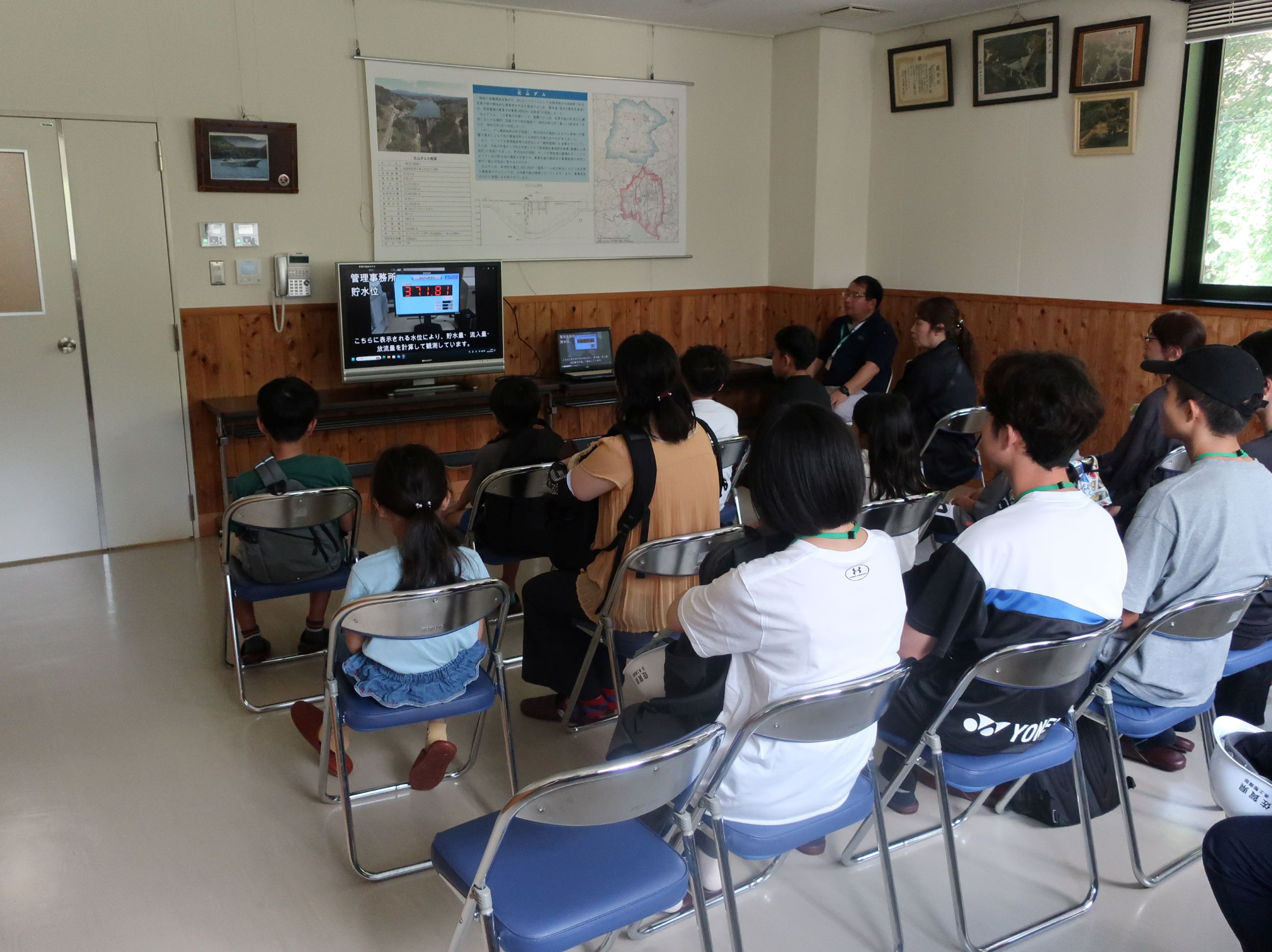 ダムの概要や各施設の役割について学び、操作室では取水ゲートの模擬操作を体験しました。また車庫では九州農政局と一般社団法人九州環境管理協会のご協力のもと、パネル展示や生き物観察を行い農業の大切さについて考えてもらいました。