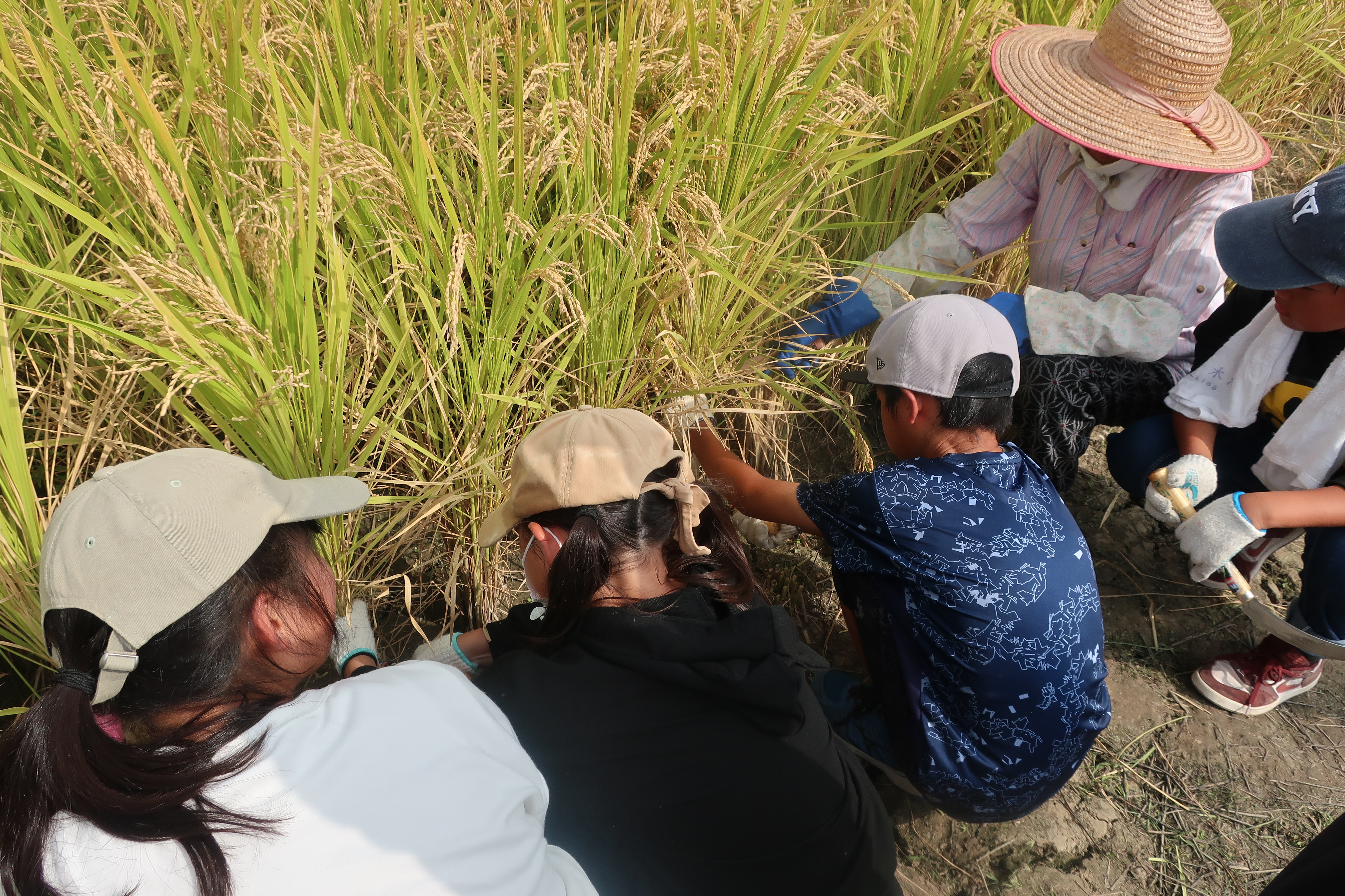 令和7年10月14日(火)に神野小学校4年生、若楠小学校5年生による稲刈り体験が行われました。