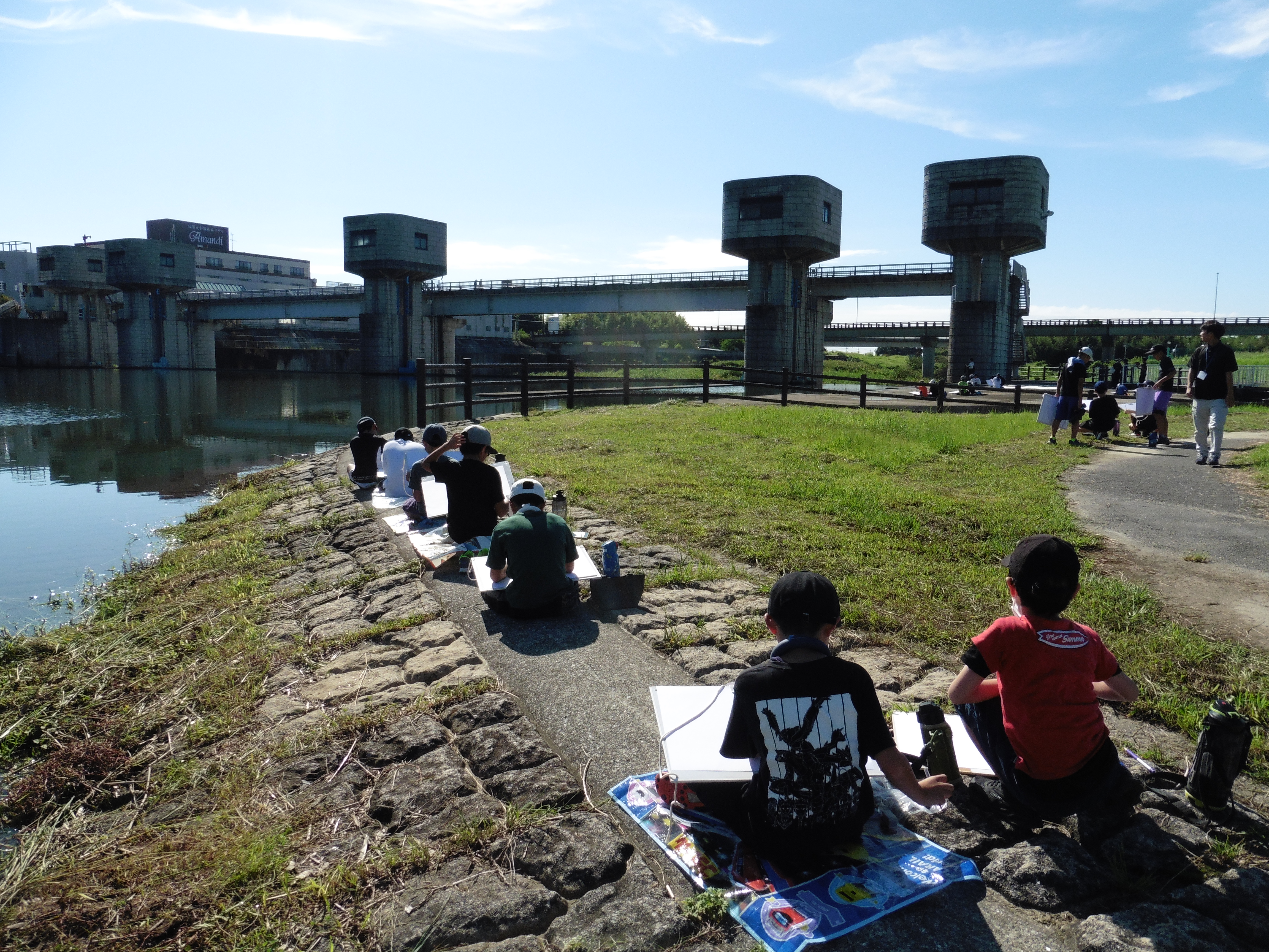 施設の役割や水の流れなどを学んでもらうためスケッチ大会を行いました。 春日北小学校5・6年生(約30名)を対象に頭首工を見学し施設の説明を聞いた後、それぞれ思い思いの場所から頭首工や周辺の風景をスケッチしてもらいました。大会当日は天気も良く、残暑が続く中での開催でしたが、みなさん一生懸命書いていました。